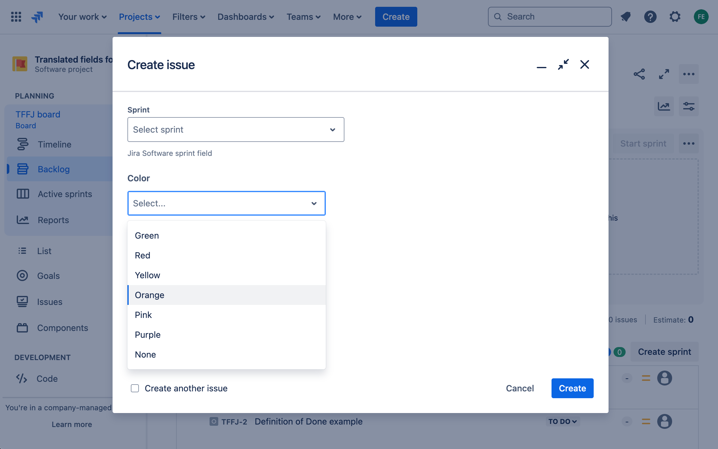 When a Translated field is displayed in Create Issue View or Issue View, its options are rendered according to the user's language set in their profile.
